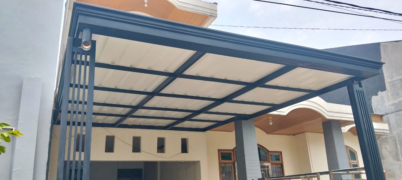Kanopi berbahan kaca tebal dengan rangka stainless atau besi galvanis, memberikan tampilan elegan